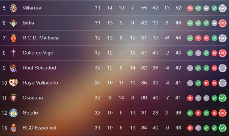 El Espanyol, además de estar a solo seis puntos del 7º lugar (último con acceso europeo actualmente), tiene como ventaja su partido pendiente ante el Villarreal. De ganarlo, los blanquiazules sumarían 41 puntos y se colocarían a las puertas de las posiciones europeas, igualando al Rayo (10º) y Osasuna (11º), ambos con 41.