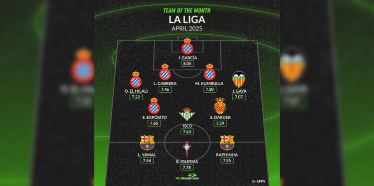 El rendimiento colectivo del Espanyol durante el mes de abril no solo ha servido para alejar fantasmas en la clasificación y acercar la permanencia, sino también para colocar al equipo como el gran dominador del once ideal mensual elaborado por el portal especializado WhoScored, que se basa en datos objetivos y rendimiento individual.
