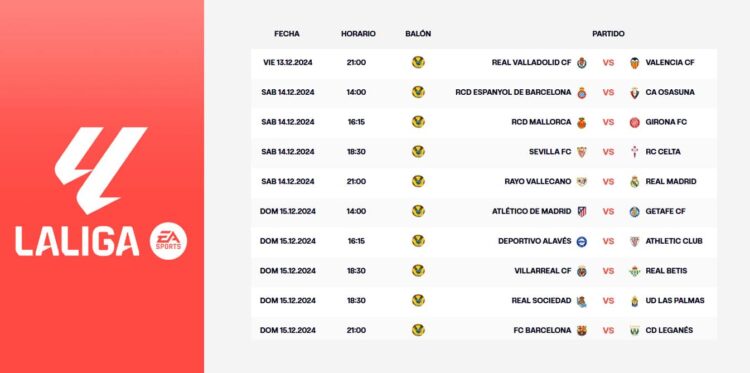 La jornada arrancará el viernes 13 de diciembre con la disputa del Valladolid – Valencia en el José Zorrilla (21:00 horas). El sábado se disputarán cuatro partidos: el Espanyol – Osasuna (14:00 horas), el Mallorca – Girona (16:15 horas), el Sevilla – Celta (18:30 horas) y el Rayo – Real Madrid (21:00 horas).