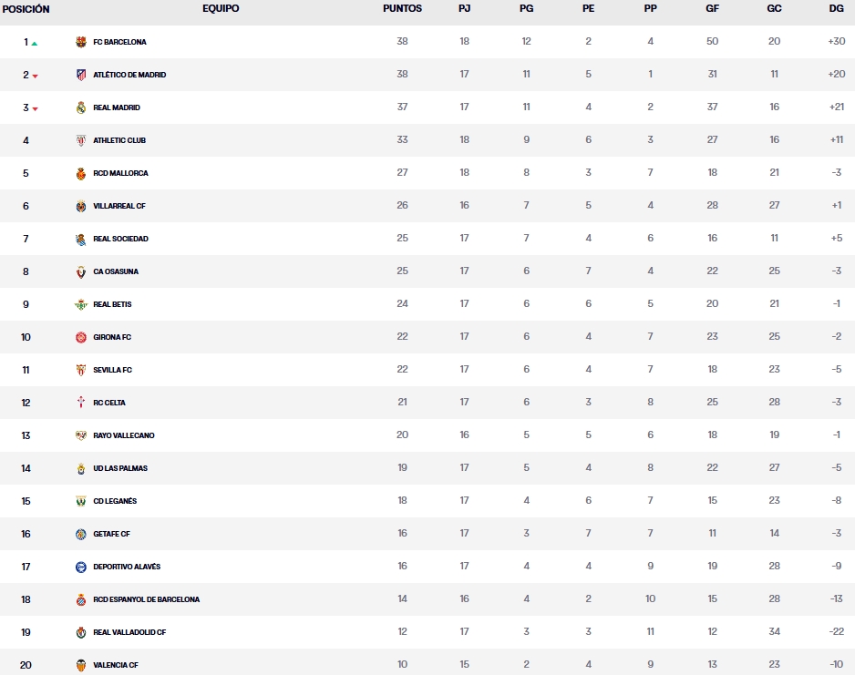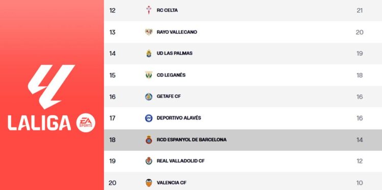 Finaliza la jornada 17 de LaLiga EA Sports, la penúltima de este año 2024. La jornada arrancaba el viernes 13 de diciembre con la disputa del Valladolid – Valencia en el José Zorrilla, partido que finalizaba con el triunfo de los pucelanos que envíaban a su rival al último lugar de la tabla. El sábado se disputaban cuatro partidos: el Espanyol – Osasuna (0-0), el Mallorca – Girona (2-1), el Sevilla – Celta (1-0) y el Rayo – Real Madrid (3-3). Para el domingo quedaba el grueso de la jornada: Atlético – Getafe (1-0), Alavés – Athletic (1-1), Villarreal – Betis (1-2), Real Sociedad – Las Palmas (0-0) y, para cerrar, el Barcelona – Leganés (0-1). El Espanyol, tras su empate ante el Osasuna de Vicente Moreno, queda 18º en la tabla con 14 puntos, a 2 de la permanencia, que marcan Alavés y Getafe con 16; eso sí, los blanquiazules están con un partido menos, el que el miércoles les enfrentará al Valencia en el RCDE Stadium. Es decir, un triunfo de los de Manolo González permitiría que saliesen de las plazas de descenso.