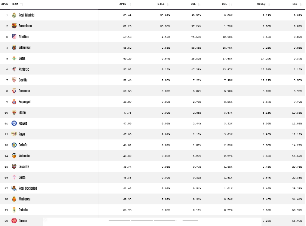 Tras la derrota frente al Betis, el superordenador de Opta rebajó las expectativas: el Espanyol baja al noveno puesto proyectado con 48,09 puntos finales, apenas un 2,78% de opciones de Champions y un 9,72% de riesgo de descenso. En la clasificación “virtual” de puntos esperados, sin embargo, el equipo aparece quinto con 13,3 puntos, lo que confirma que el juego está siendo mejor que los resultados.