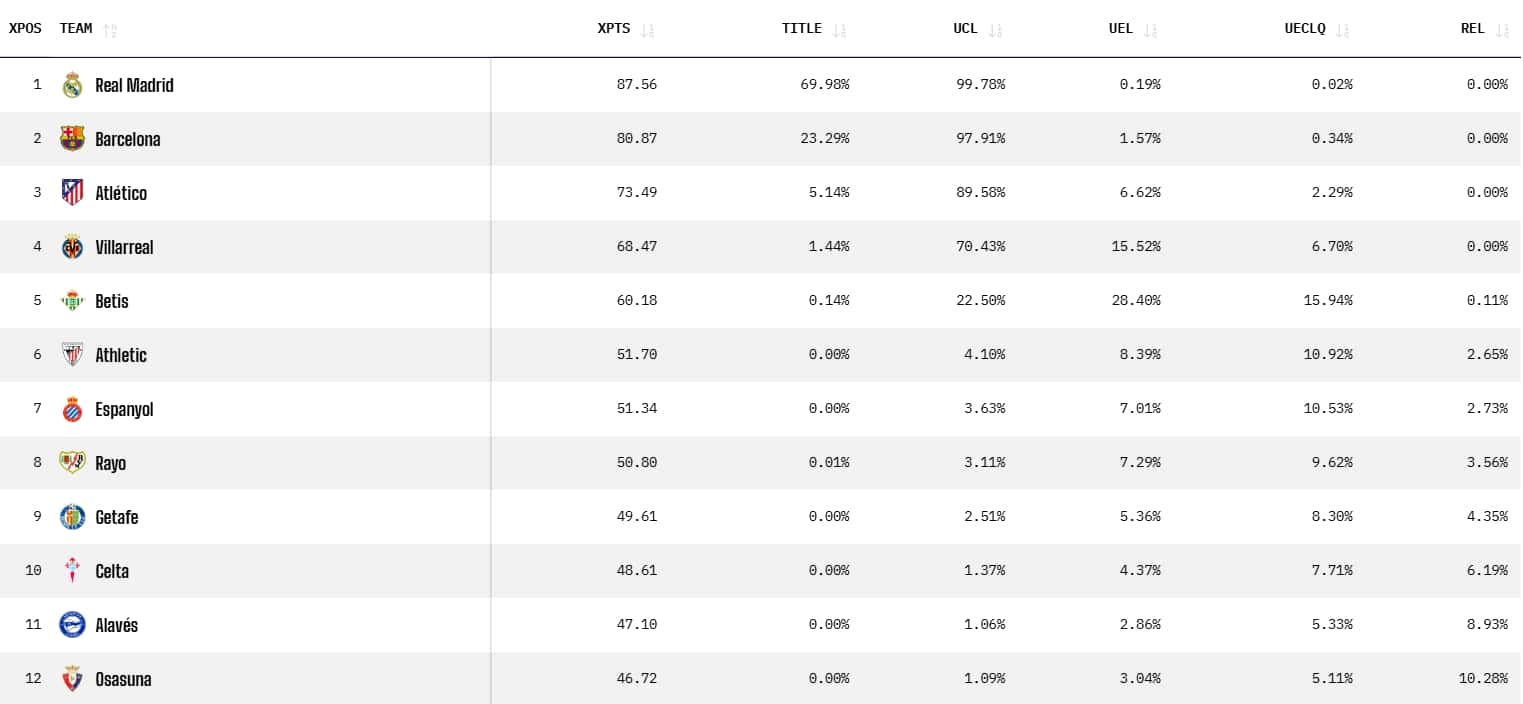En la tabla de xPts (puntos esperados), el Espanyol baja del segundo al cuarto lugar. Pasa de los 18,1 puntos tras 10 jornadas a los 17,3 actuales, lo cual no deja de ser una cifra notable. Se sitúa justo por detrás de Madrid, Atlético y Barcelona.