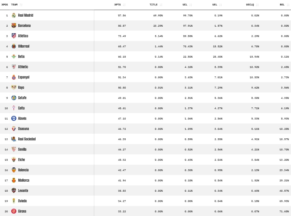 La nota de tranquilidad sigue estando abajo. El Espanyol apenas tiene un 2,75% de opciones de descender, según las simulaciones de Opta. La cifra ha subido un poquito desde el 2,23% de hace una semana, pero sigue siendo bajísima. Para ponerlo en contexto: el Girona roza el 72% de descenso, el Oviedo el 65%, el Levante el 40,5% y el Mallorca y la Real Sociedad se mueven entre el 21% y el 25%. A nivel matemático, el Espanyol está en otra liga.
