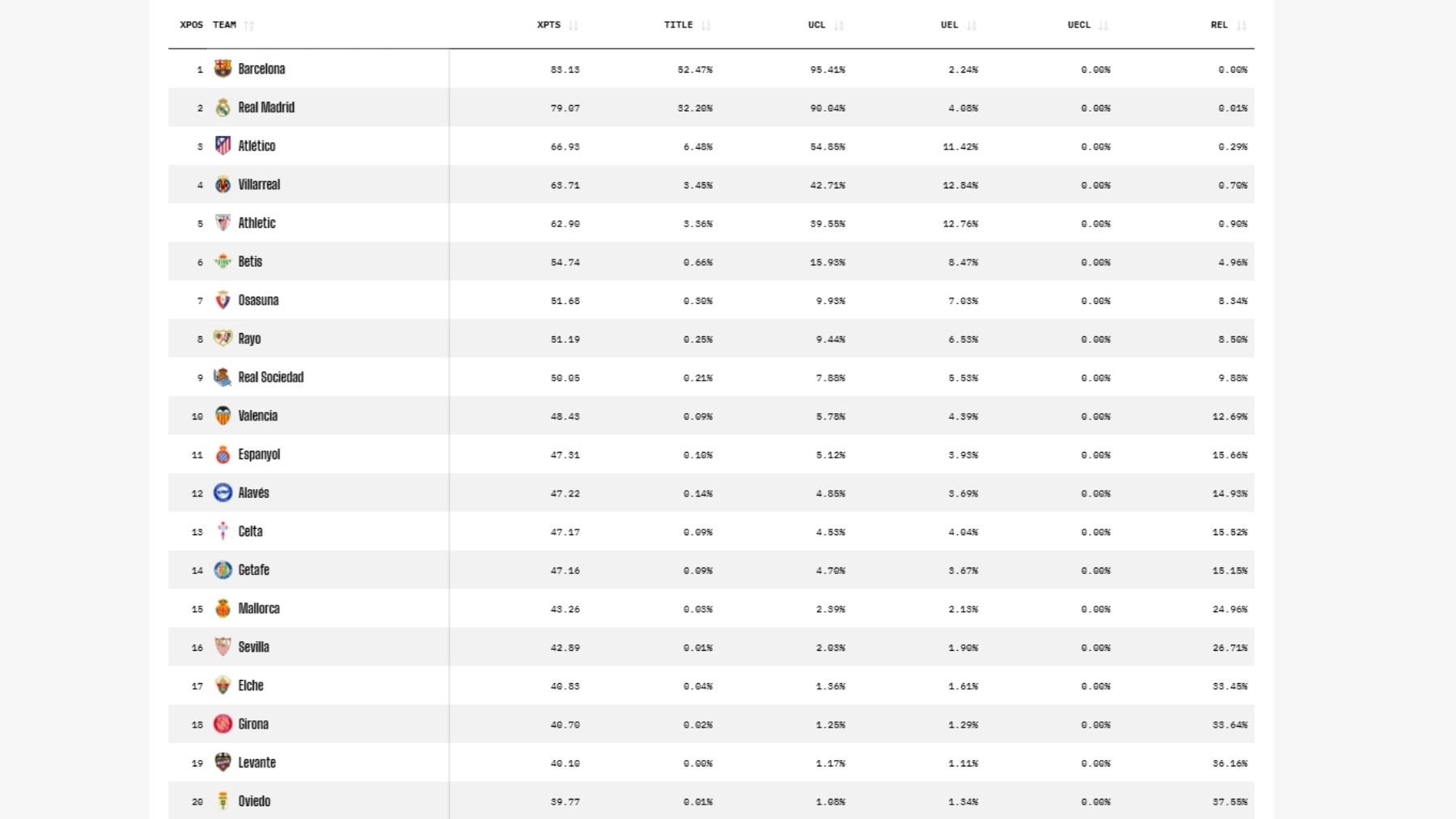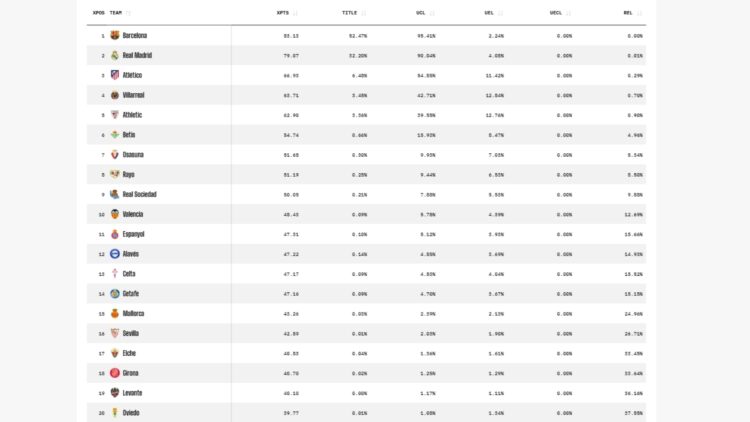 En la zona baja, los cálculos dejan claras las urgencias. El Oviedo aparece como el principal candidato al descenso (37,5% de probabilidades de bajar), seguido muy de cerca por Levante (36,1%), Girona (35,6%) y Elche (33,4%). Eso sí, también Sevilla y Mallorca salen tocados en las simulaciones y rondan porcentajes preocupantes.