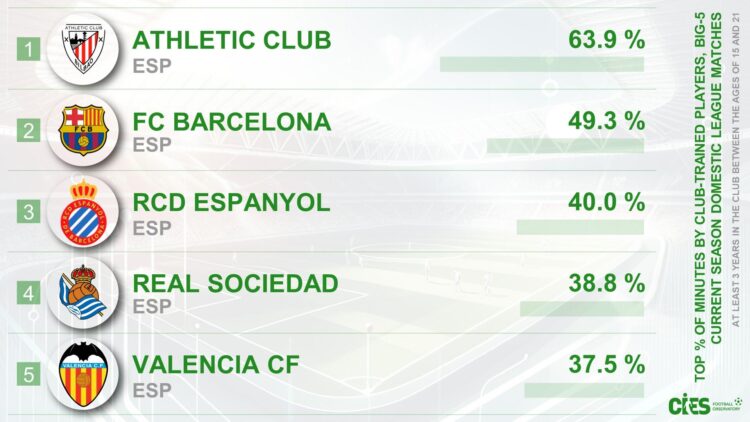 Los responsables deportivos del Espanyol llevan tiempo llevando a cabo una política en la que, ante las dificultades económicas de la entidad, apuestan claramente por el papel de la cantera. Algo que debe crecer en el futuro, pero que ya es destacado en el presente: el Atlas Demográfico elaborado por el prestigioso centro de investigación suizo CIES Football Observatory revela que el Espanyol está en el top 3 de equipos que más emplea a sus canteranos de las cinco grandes ligas. Lidera esta clasificación el Athletic (63,9 % de los minutos disputados por jugadores formados en Lezama), que además encabeza el ranking a nivel europeo, Barcelona (49,3%), el RCD Espanyol (40%), la Real Sociedad (38,8 %) y el Valencia CF (37,5 %). El Observatorio de Fútbol CIES sigue los criterios de la UEFA para considerar a un futbolista canterano, considerando como tales a aquellos que hayan jugado en equipos del club al menos durante tres temporadas entre los 15 y los 21 años.