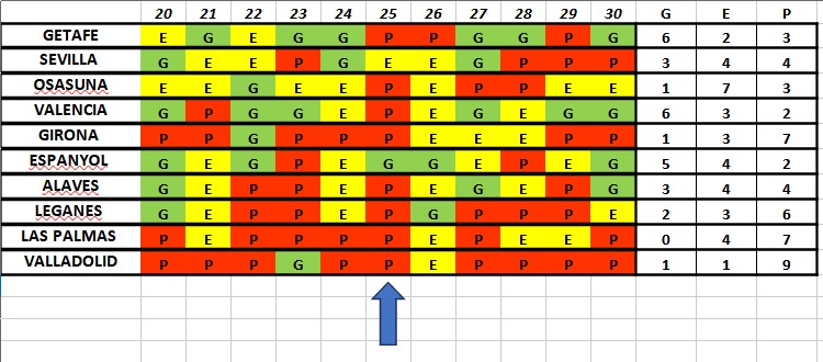 Y por último, el Getafe. Que no solo no sufre, sino que casi se ha colado en la pelea por Europa: seis victorias, dos empates y tres derrotas. Uno de los mejores equipos de este tramo liguero.