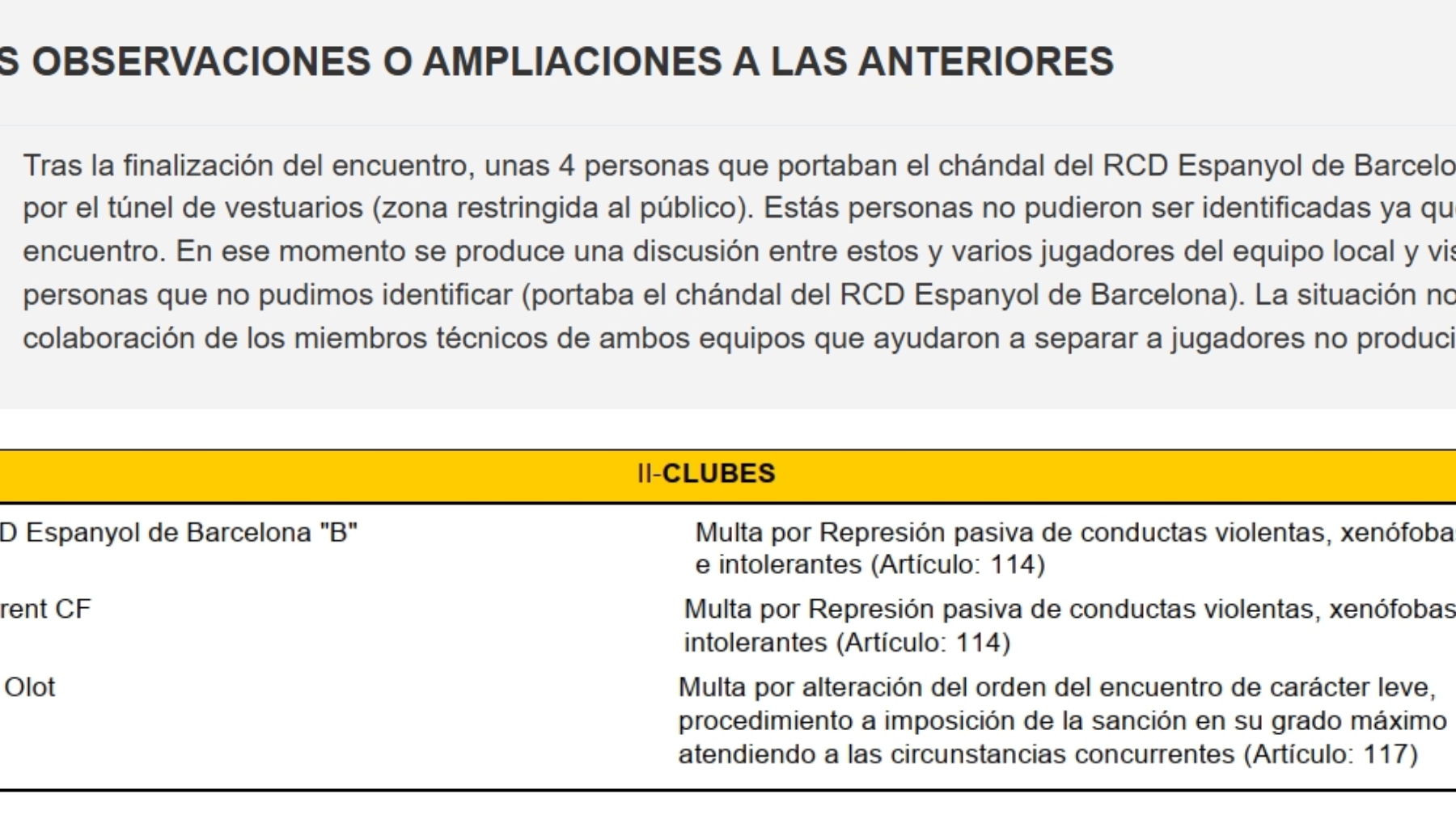 La Real Federación Española de Fútbol ha impuesto una multa al RCD Espanyol por no haber reprimido adecuadamente conductas violentas tras el partido entre su filial y el del FC Barcelona. Según el acta arbitral, cuatro personas vestidas con el chándal oficial del club perico accedieron sin autorización al túnel de vestuarios y protagonizaron una discusión con varios jugadores azulgranas. Aunque el incidente no fue a más gracias a la intervención de los cuerpos técnicos de ambos equipos, la RFEF considera que hubo una “represión pasiva” de comportamientos inapropiados.