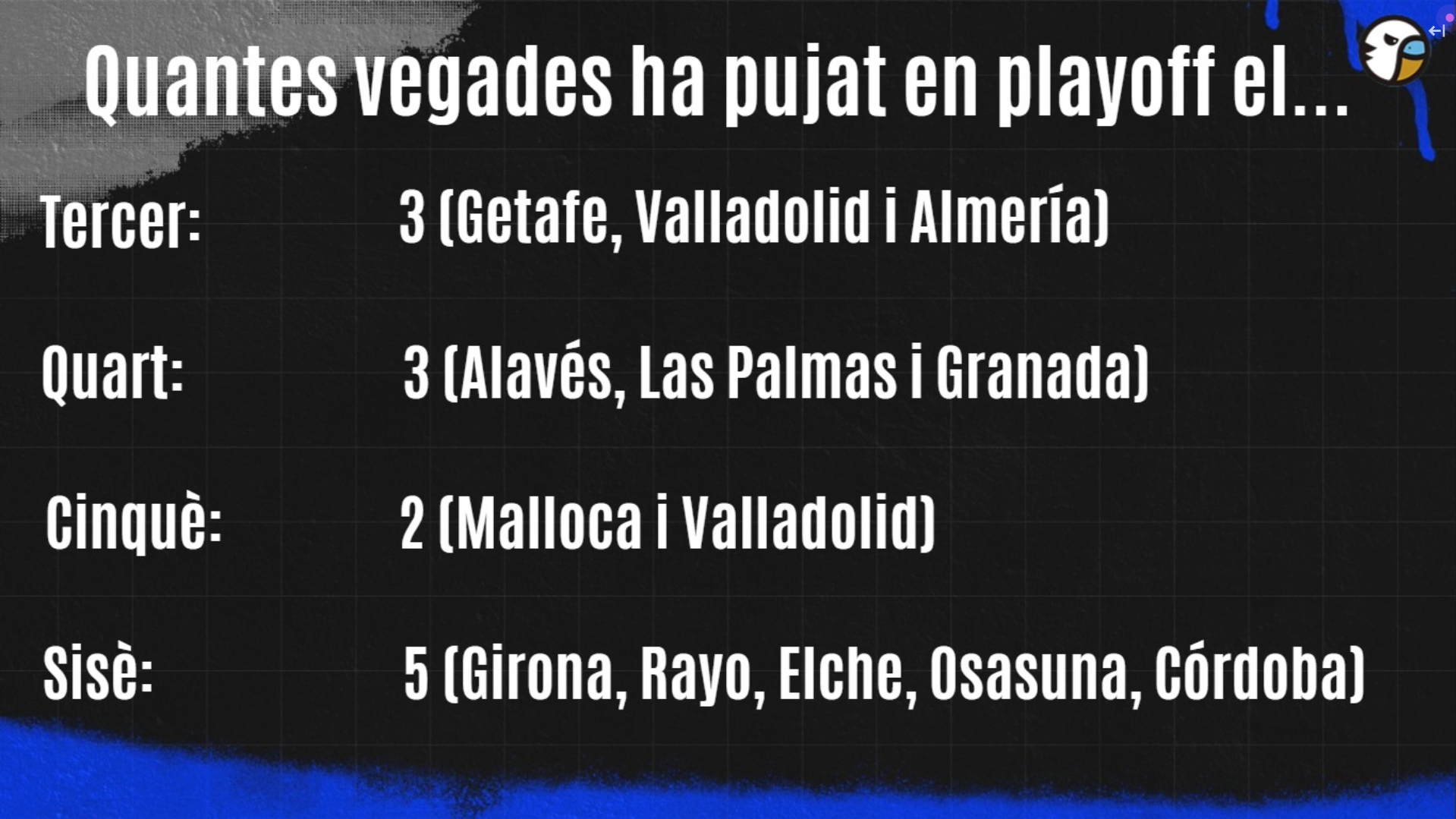 En nuestra sección de análisis, nuestros compañeros Àlex Cobas y Ramon Borrós nos han hecho un análisis de los 13 playoffs anteriores, para determinar cuantas veces ha subido cada equipo dependiendo de la clasificación final -curiosamente, el sexto ha sido el que más veces lo ha hecho, con 5, por 3 el tercero y el cuarto, y dos el quinto. En los últimos años, se ha acentuado esta tendencia de que suba el sexto clasificado.