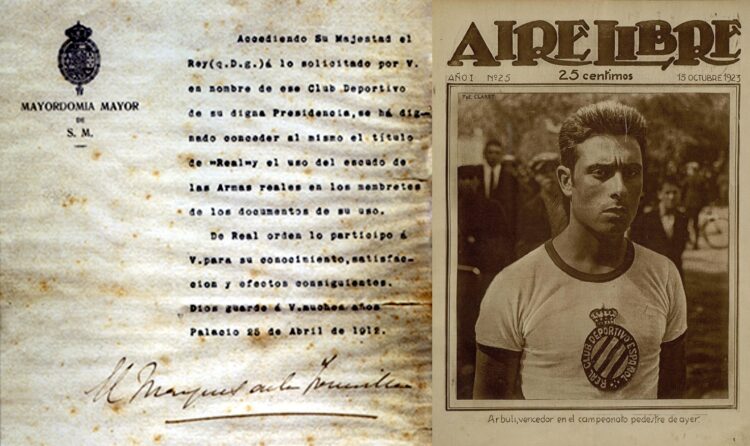 Bosch explica como esta distinción de “real” que portan diferentes clubes a todo lo largo de la geografía nacional se remonta a principios del siglo pasado relacionada con una supuesta afición del monarca Alfonso XIII por el fútbol, lo cual lo llevó a impulsar la creación de una competición con su título el 1903 y, más adelante, a otorgar el adjetivo de “real” a los clubes que lo solicitaran, petición que era bastante habitual que fuera correspondida con el nombramiento del monarca como socio de honor. La petición del Espanyol se presentó el 28 de febrero del 1912; la firmaba Santiago de la Riva como presidente y “propietario” de la entidad. En el escrito se destacaba que el club se había fundado el 1900, que tenía más de 600 socios, entre los cuales había “distinguidos aristócratas”, y que se dedicaba “al fomento del deporte, celebrando fiestas deportivas y otras actividades que van en beneficio de la cultura física”; en la parte superior del escrito se puede leer una anotación en la cual se deja constancia que la concesión estaba avalada por Baltasar de Losada, conde de Maceda y “Grande de España”. Explica pero Bosch como según una información aparecida en el diario ‘Mundo Deportivo’ se destacaban “las gestiones y los trabajos” de José Ciudad, vicepresidente del club. La gracia real se obtuvo el 25 de abril del 1912, tan solo dos meses después de la petición, con lo cual el Espanyol pasaba a añadir el “Real” a su denominación, y se le permitía el uso del escudo de las armas reales “en las cabeceras de los documentos de su uso”.