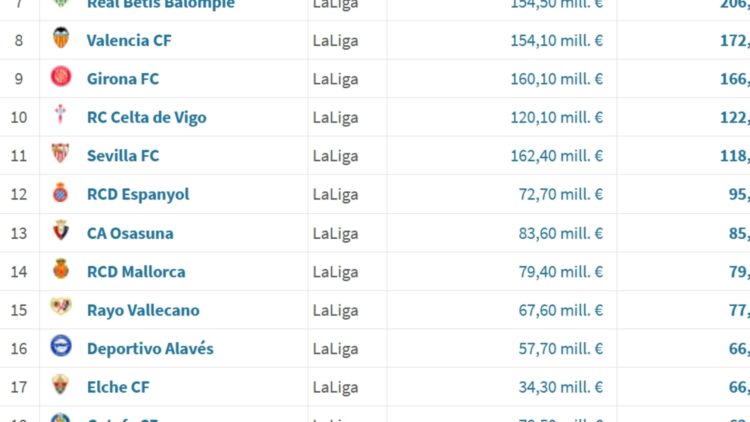 | 9 | Girona FC | LaLiga | 160,10 mill. € | 166,60 mill. € | 4,1 % |