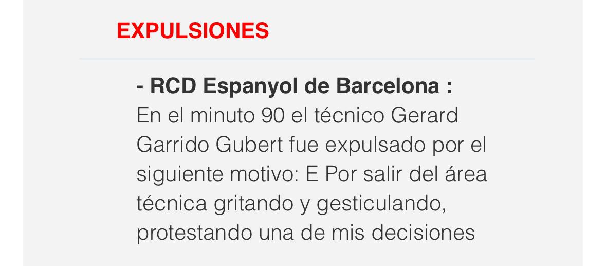 Por otra parte, ya hay acta del colegiado sobre lo sucedido durante y a la finalización del encuentro. Por una parte, Quintero Gómez explica que ha expulsado del banquillo a Gerard Garrido, segundo entrenador blanquiazul, por “salir del área técnica gritando y gesticulando, protestando una de mis decisiones”.Por lo que respecta al incidente posterior a la finalización del encuentro. éste es el redactado: “Una vez finalizado el partido, encontrándonos en la entrada al túnel de vestuarios, se produce un lanzamiento de un vaso de plástico de tamaño medio y lleno de líquido hacia mi persona, impactando en mi pecho con fuerza. Dicho objeto fue arrojado por un aficionado que portaba una camiseta del club local desde encima del túnel. Ante esto, solicité la identificación del individuo por parte de las fuerzas y cuerpos de seguridad, resultando positiva conforme me comunica el coordinador de seguridad.