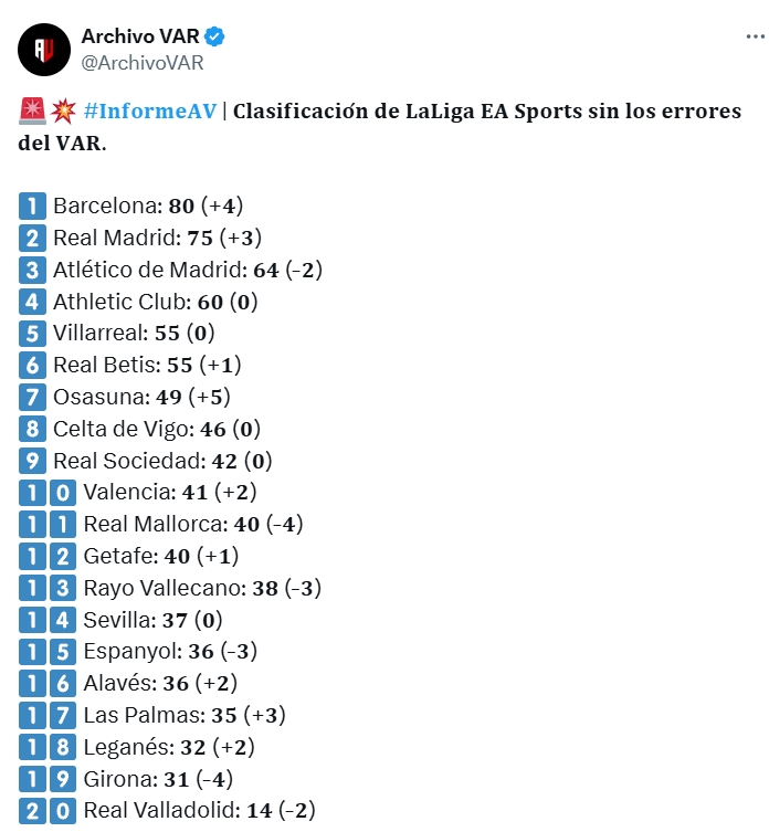 El estudio, titulado “𝐈𝐧𝐟𝐨𝐫𝐦𝐞𝐀𝐕 | 𝐂𝐥𝐚𝐬𝐢𝐟𝐢𝐜𝐚𝐜𝐢𝐨́𝐧 𝐝𝐞 𝐋𝐚𝐋𝐢𝐠𝐚 𝐄𝐀 𝐒𝐩𝐨𝐫𝐭𝐬 𝐬𝐢𝐧 𝐥𝐨𝐬 𝐞𝐫𝐫𝐨𝐫𝐞𝐬 𝐝𝐞𝐥 𝐕𝐀𝐑”, señala que el Espanyol tendría 36 puntos, tres menos que los que suma actualmente. Esto situaría al equipo en 15ª posición, solo cuatro puntos por encima del descenso.