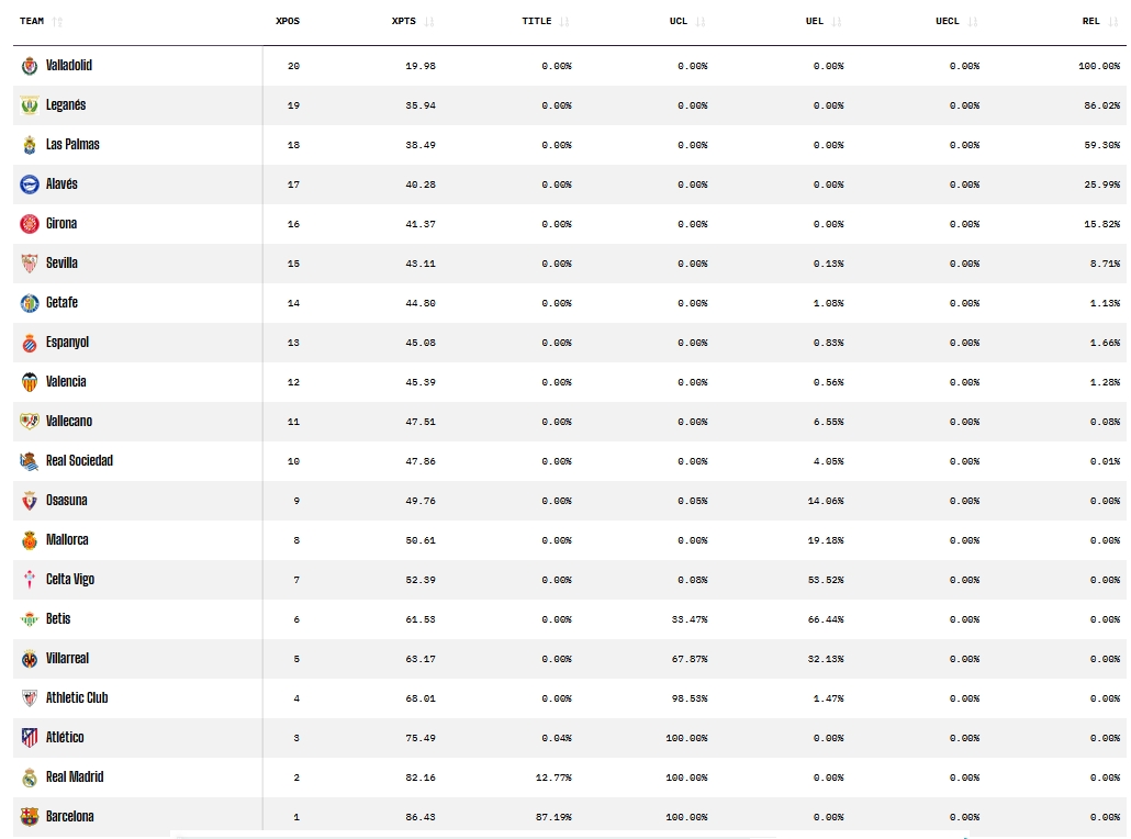 En cuanto a la posibilidad de alcanzar competición europea, el algoritmo también es claro: apenas un 0,83% de opciones de clasificarse para la Conference League. Un sueño lejano que, salvo sorpresa, no entrará en los planes de esta temporada.