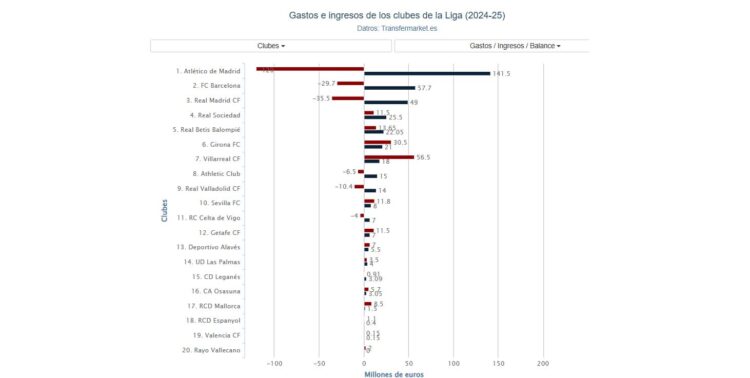 El Girona, que ha generado unos ingresos de 51,50 millones de euros con las salidas de Aleix García, Alexander Callens, Artem Dovbyk y Pau Víctor, ha gastado 29 millones de euros en el mercado de fichajes de verano incorporando futbolistas como Abel Ruiz, Alejandro Francés, Bojan Miovski, Donny van de Beek y Ladislav Krejci. Por otra parte, hay equipos en serias dificultades como el Getafe, que tras gastar siete millones de euros tiene sólo 16 jugadores del primer equipo inscritos.