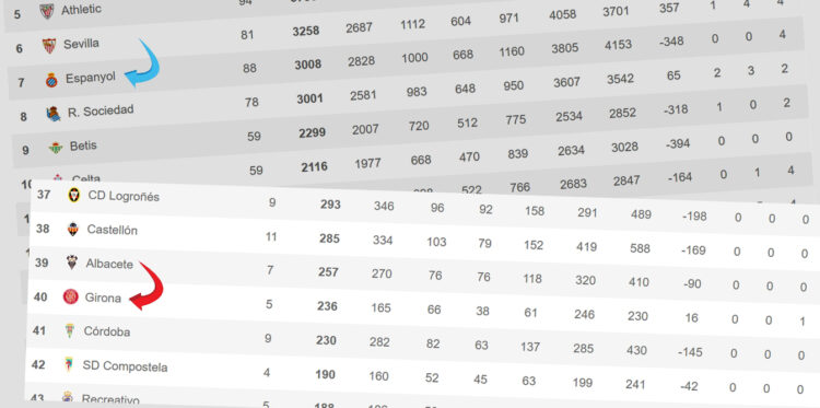En el caso del Girona, su historia en Primera es breve, pero está marcada por un crecimiento vertiginoso. Con tan solo cinco temporadas en la máxima categoría, los de Montilivi ocupan el puesto 40 en la clasificación histórica de LaLiga: sus 236 puntos en 165 partidos son fruto de 66 victorias, 38 empates y 61 derrotas, 246 tantos por favor por 230 en contra.