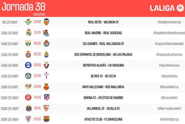 LaLiga ha confirmado los horarios de la Jornada 38 de LaLiga EA Sports 24-25, que arrancará el viernes 23 con la disputa del duelo entre Real Betis y Valencia CF a las 21:00 horas.