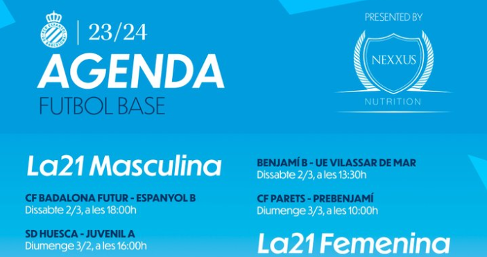 El Espanyol ha publicado en redes sociales los diferentes horarios de las categorías inferiores pericas. Además, se destacan los encuentros del Espanyol B ante el líder de la segunda RFEF, que se disputará este sábado a las 18:30 horas. Por otro lado, en la CE Dani Jarque se podrán disfrutar partidos atractivos como el Alevín B contra el Sant Gabriel o el Benjamín B ante el UE Vilassar de Mar, ambos el sábado a las 13:30 horas.