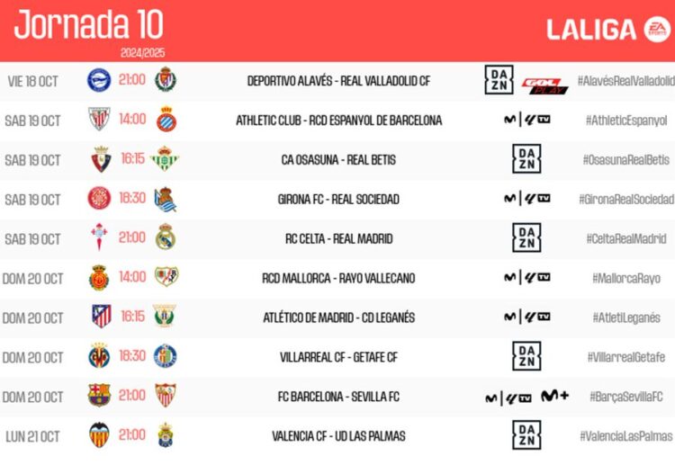 LaLiga ha hecho oficiales los horarios de los partidos que componen la décima jornada de LaLiga EA Sports 2024-25. La jornada arranca el viernes 18 de octubre, a las 21:00 horas, con el encuentro entre el Deportivo Alavés y el Real Valladolid, y finalizará el lunes 21 a las 21:00 horas en Mestalla con el choque entre Valencia CF y UD Las Palmas.