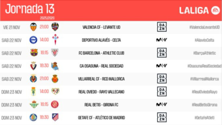 Aquí van, ordenados por día y hora, los partidos confirmados por LaLiga para la jornada 13: