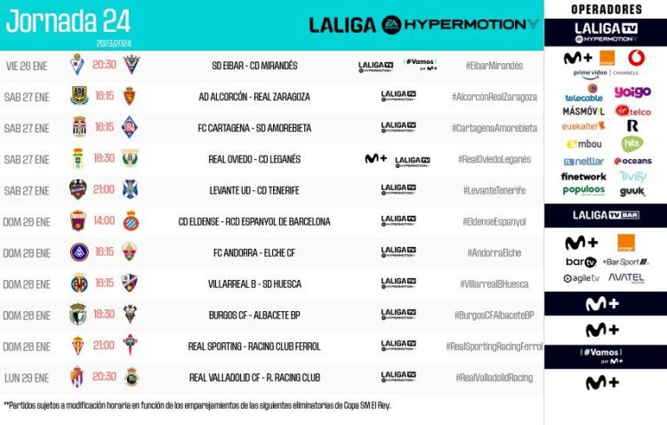 LaLiga ha hecho públicos los horarios de la jornada 24 de LaLiga Hypermotion, que arrancará el viernes 26 de enero con el partido entre la SD Eibar y el CD Mirandés a partir de las 20:30 horas en Ipurúa, y finalizará el lunes 29 desde las 20:30 horas con el Real Valladolid – Racing Club.
