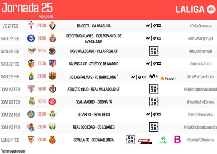 LaLiga ha hecho oficiales los horarios de los partidos que componen la Jornada 25 de LaLiga EA Sports 2024-25, que arrancará el viernes 21 de febrero a partir de las 21:00 horas en Vigo con el encuentro entre el RC Celta y el CA Osasuna, y finalizará el lunes 24 a la misma hora con el duelo Sevilla FC – RCD Mallorca. Por lo que respecta al Espanyol, jugará el sábado 22 de febrero a las 14:00 horas en Mendizorroza ante el Alavés.