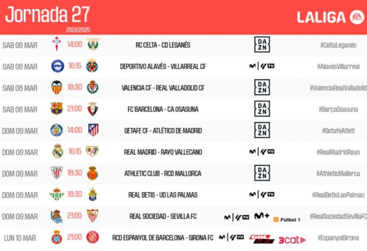 LaLiga ha hecho oficiales los horarios de los partidos que componen la Jornada 27 de LaLiga EA Sports 2024-25, que arrancará el sábado 8 de marzo a partir de las 14:00 horas con el encuentro entre el Celta y el Leganés, y finalizará el lunes 10 a las 21:00 horas en el RCDE Stadium con el RCD Espanyol – Girona FC.