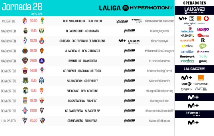 LaLiga ha hecho públicos los horarios de la jornada 28 de LaLiga Hypermotion, que arrancará el viernes 23 de febrero con el partido entre el Real Valladolid y el Real Oviedo a partir de las 20:30 horas en el José Zorrilla, y finalizará el lunes 26 desde las 20:30 horas con CD Mirandés-SD Huesca. Por lo que respecta al Espanyol, jugará en Ipurúa ante la SD Eibar el sábado 24 de febrero a las 18:30 horas.