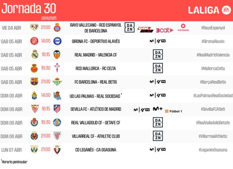 LaLiga ha hecho oficiales los horarios de los partidos que componen la jornada 30 de LaLiga EA Sports 2024-25, que arrancará el viernes 4 de abril a partir de las 21:00 horas con el encuentro entre el Rayo Vallecano y el Espanyol. La jornada cerrará el lunes a las 21:00 horas con el enfrentamiento entre CD Leganés y CA Osasuna en Butarque.