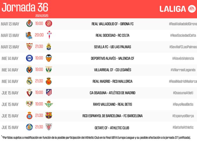 HORARIOS | Consulta cuándo se jugarán los encuentros de la jornada 36 de #LALIGAEASPORTS. pic.twitter.com/ZDHIpxHKag