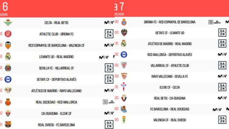 Y casi sin tiempo para respirar, llega la jornada 7, donde el Espanyol tendrá otro partido señalado: visita a Montilivi para medirse al Girona el viernes 26 a las 21:00h. Un derbi catalán en horario de prime time, perfecto para abrir un fin de semana cargado de fútbol. Esa fecha inaugura una jornada potente que seguirá el sábado 27 con cuatro encuentros, incluido el Atlético de Madrid – Real Madrid a las 16:15h en el Metropolitano. El domingo habrá otros cuatro partidos y el telón se bajará el lunes 29 con el Valencia – Oviedo en Mestalla.