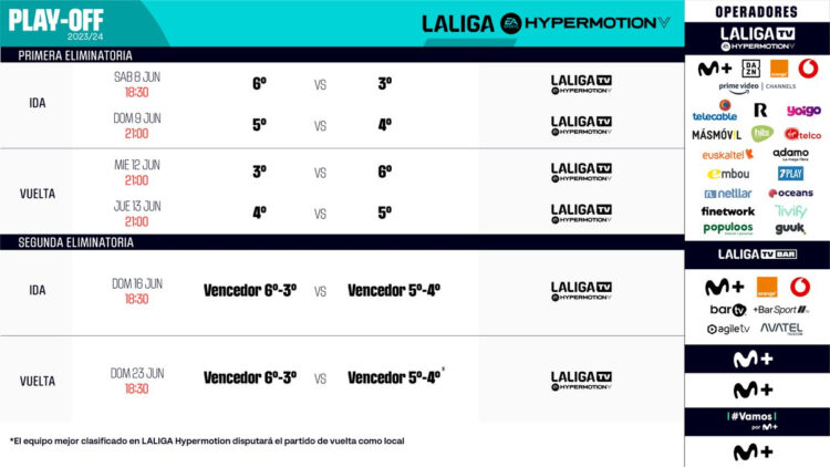 A falta de conocer los equipos que ocuparán la 3ª, 4ª, 5ª y 6ª posición de LaLiga Hypermotion y de si en ellos está el RCD Espanyol, LaLiga ha anunciado ya los horarios de los seis encuentros que compondrán el playoff de ascenso a Primera, la denominada comercialmente LaLiga EA Sports.