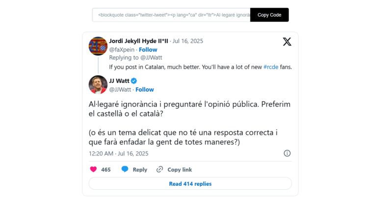 La historia empieza con un tuit de Watt en castellano: “Creo que disfrutaré de Los Periquitos”, dejando clara su ilusión por el nuevo proyecto. Nada fuera del guion… hasta que un aficionado le respondió en inglés: “Si publicas en catalán, mucho mejor. Tendrás muchos nuevos fans”. Y ahí empezó todo.