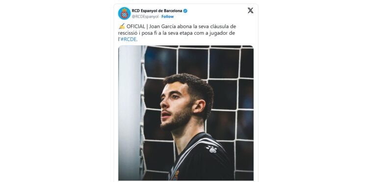 El RCD Espanyol ha dicho adiós a Joan García, pero lo ha hecho de una forma muy distinta a la habitual. Lejos del tono agradecido y protocolario que suele acompañar las despedidas de jugadores que han pasado por el primer equipo, el club ha optado por un mensaje frío, breve y absolutamente aséptico. Un comunicado que, sin necesidad de extenderse, transmite con claridad el malestar de la entidad por la forma en la que se ha producido su salida: “OFICIAL | Joan García abona la seva clàusula de rescissió i posa fi a la seva etapa com a jugador de l’#RCDE.”