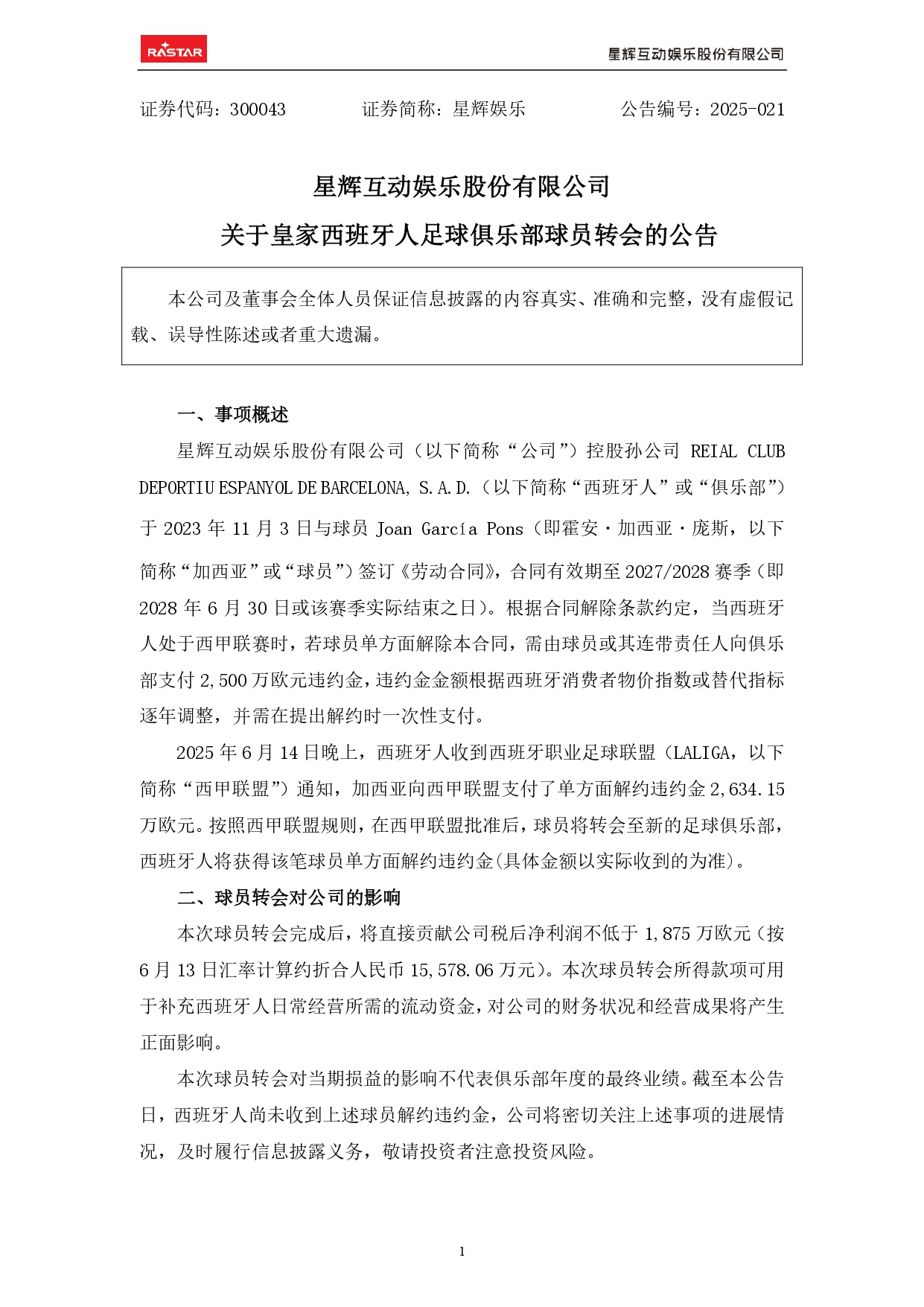 La empresa Xinghui Interactive Entertainment Co., Ltd. (en adelante, “la empresa”) informa que su filial controlada, Reial Club Deportiu Espanyol de Barcelona, S.A.D. (en adelante, “RCD Espanyol” o “el club”), firmó el 3 de noviembre de 2023 un contrato laboral con el jugador Joan García Pons (en adelante, “Joan García” o “el jugador”), con vigencia hasta el final de la temporada 2027/2028 (es decir, hasta el 30 de junio de 2028 o la fecha de finalización efectiva de esa temporada).