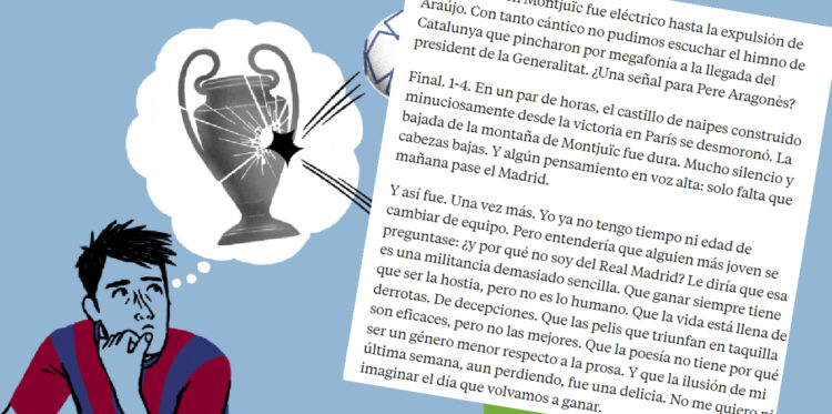 “Y así fue. Una vez más. Yo ya no tengo tiempo ni edad de cambiar de equipo. Pero entendería que alguien más joven se preguntase: ¿y por qué no soy del Real Madrid? Le diría que esa es una militancia demasiado sencilla. Que ganar siempre tiene que ser la hostia, pero no es lo humano. Que la vida está llena de derrotas. De decepciones. Que las pelis que triunfan en taquilla son eficaces, pero no las mejores. Que la poesía no tiene por qué ser un género menor respecto a la prosa. Y que la ilusión de mi última semana, aun perdiendo, fue una delicia. No me quiero ni imaginar el día que volvamos a ganar”.
