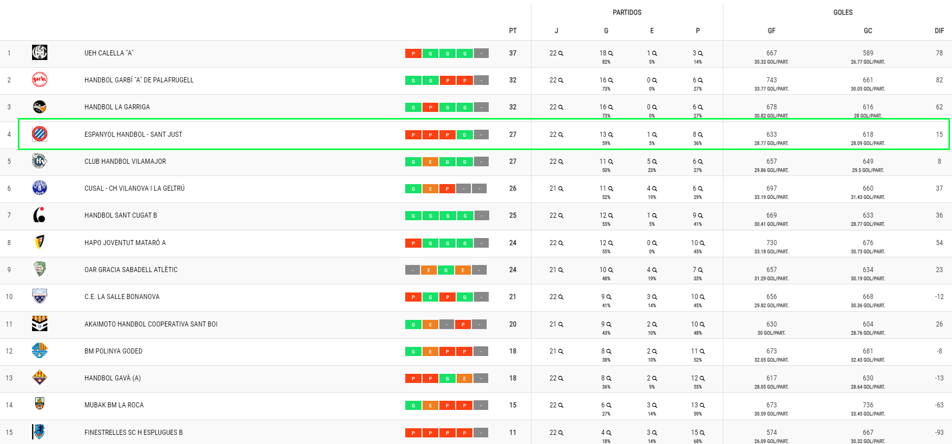 Los jugadores entrenados por David Vilella suman una gran victoria ante el HANDBOL GARBÍ “A” DE PALAFRUGELL en casa (31-25). El conjunto perico a mitad de tiempo iba perdiendo por seis goles de diferencia, pero un acelerón en los últimos 10′ de encuentro -con nueve goles- dan el partido a un gran ESPANYOL HANDBOL – SANT JUST. Cabe también destacar la participación de Darío Kalina Martínez, que anotó ocho de los 31 goles del equipo, seguido muy de cerca por Manuel Mauriz González, con seis. El equipo está cuarto en la clasificación a diez del líder de la categoría, el UEH CALELLA “A”. El próximo encuentro será el correspondiente a la jornada 24, el día sábado 17 de febrero a las 18 horas, en la visita al CEM NOVA ICÁRIA, para enfrentarse al HANDBOL POBLENOU A, que es el colista de la categoría.