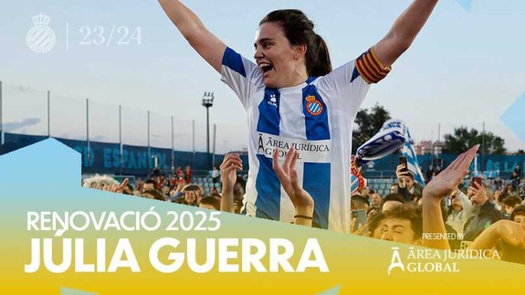 Las responsables del RCD Espanyol Femenino han llegado a un acuerdo con Júlia Guerra para ampliar su contrato con la entidad. Así, la central formada en las categorías inferiores de La21 –lleva defendiendo la camiseta blanquiazul durante doce temporadas- jugará en la máxima categoría del fútbol femenino español durante la próxima temporada. En la campaña del ascenso, Júlia Guerra, baluarte en la defensa del equipo, ha sido la segunda jugadora, por detrás de Carol Marín, que más minutos ha disputado.