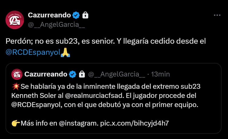 El extremo izquierdo del Espanyol Kenneth Soler podría salir cedido al Murcia; así lo avanza Ángel García, conocido en redes como ‘Cazurreando’, toda una referencia en movimientos de mercado en categorías inferiores.