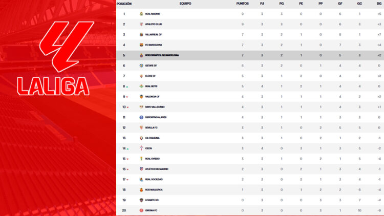 Ya ha finalizado la tercera jornada de LaLiga vive su tercera jornada, la última antes del primer parón de selecciones. Así han quedado los resultados y así está la clasificación antes de que vuelva la competición, el viernes 12 de septiembre con un Sevilla – Elche; la cita para el Espanyol, que se ha plantado en este punto del curso con 7 puntos, será el lunes 15, a las 9 de la noche, en casa y ante el Mallorca.