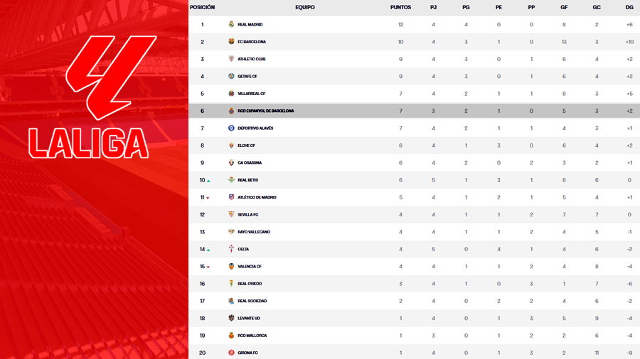Así queda la clasificación después de los partidos del domingo de la jornada 4 de LaLiga: Celta y Girona firman tablas, el Levante frena al Betis, Osasuna supera al Rayo y el Barça destroza al Valencia.