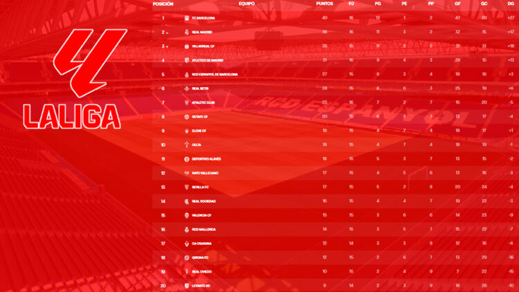 El Espanyol se ha colado en la pelea por Europa con todas las de la ley. Tras su trabajada victoria ante el Rayo Vallecano (1-0), los de Manolo González cierran la jornada 15 en quinta posición, con 27 puntos y a solo cuatro del Atlético de Madrid, que marca ahora mismo la frontera de la Champions. La clasificación devuelve una imagen sólida del conjunto blanquiazul, que ha sabido reponerse del tropiezo copero en Palma con oficio y carácter. En una jornada marcada por tropiezos inesperados y partidos abiertos, los pericos han aprovechado su momento y se confirman como uno de los equipos más fiables de la parte alta. La Liga sigue su curso… y el Espanyol, de momento, no se baja del tren europeo.