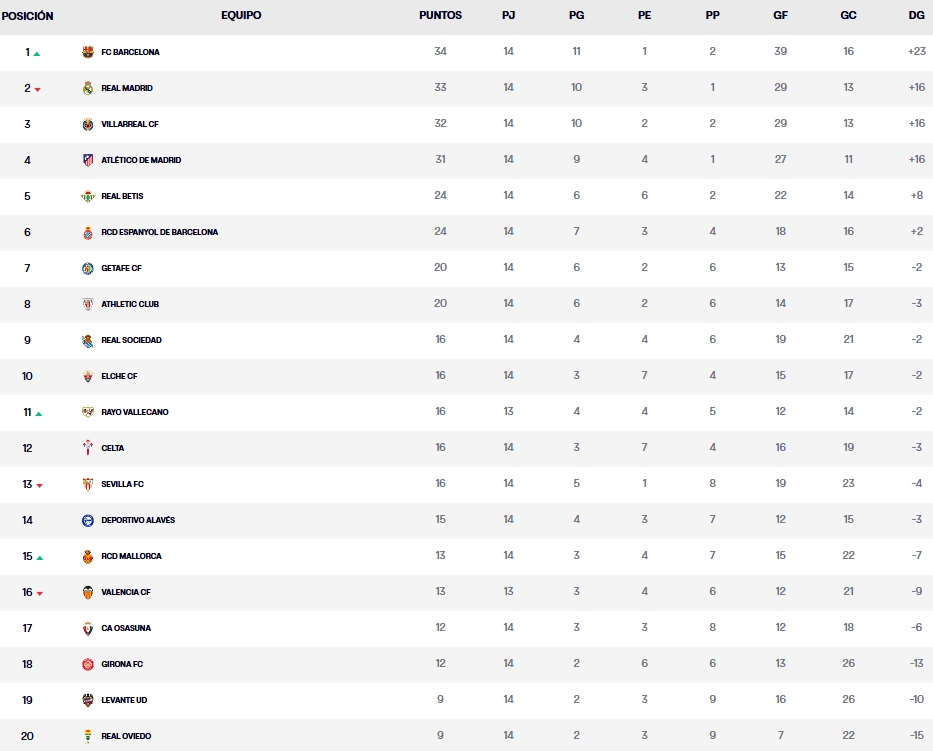 El Espanyol cerró la jornada 14 de LaLiga con una victoria importantísima ante el Celta en Balaídos (0-1) que le permite seguir instalado en puestos europeos. Los de Manolo González son sextos, igualados a puntos con el Betis -quinto tras ganar el derbi sevillano- y con cuatro de ventaja sobre sus perseguidores más inmediatos, Getafe y Athletic. En una jornada marcada por la igualdad, el equipo blanquiazul volvió a demostrar que sabe competir lejos de casa y consolida sus aspiraciones a pelear por Europa con argumentos cada vez más sólidos. Vamos a proceder al repaso de todos los partidos de esta fecha.