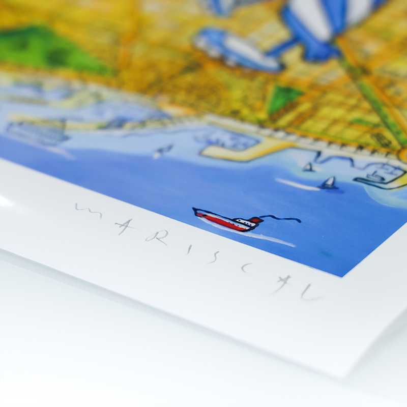 La obra reproduce el cuadro original presentado recientemente en el Reial Cercle Artístic de Barcelona, en el que Mariscal representa al perico sobre “La Grancelona”, una Barcelona reinterpretada a través de su estilo característico, con alusiones al RCDE Stadium y a la Ciutat Esportiva Dani Jarque.