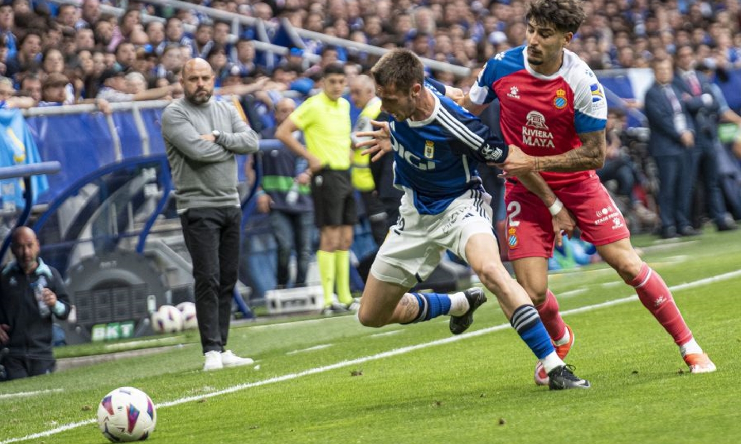 El Espanyol, por su parte, ha tenido tres técnicos a lo largo del curso, lo que deja claro que no haber ascendido de manera directa es ya de por si un fracaso. Inició el curso en el banquillo el asturiano Luis García, precisamente formado en la cantera del Oviedo, que ya había finalizado la temporada anterior, la del descenso. Tras dirigir 14 encuentros le sucedió Luis Miguel Ramis, que no dio el resultado esperado y duró 16 encuentros en el cargo. Y finalmente, el puesto fue para Manolo González, solución de la casa, ya que estaba entrenando al filial blanquiazul. Pese a no darle para lograr el ascenso directo, ha sumado una brillante racha de 14 partidos sin perder, aunque con el pero de muchos empates, 9. Su primera derrota fue precisamente en la ida de la final del playoff frente al Oviedo. Pese a esta decepción, aún tiene en su mano el lograr el que sería su mayor éxito profesional tras tres décadas como entrenador, la mayoría en el fútbol modesto. En cuanto a su futuro, en principio esta temporada marcará el final de su andadura en el primer equipo, aunque lograr el ascenso a Primera división en su primer año como entrenador profesional pare e a priori un argumento sólido para que su candidatura para seguir fuese tenida en cuenta.
