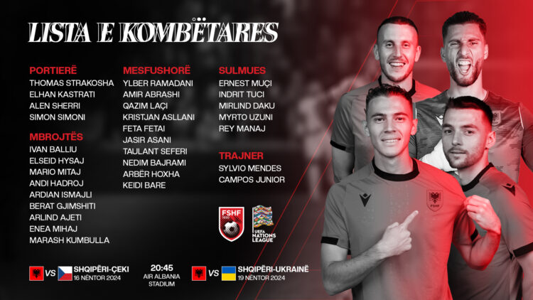 La selección de Albania disputará los dos últimos partidos del grupo B1 de la UEFA Nations League en el estadio Air Albania contra la República Checa (16 de noviembre, 20:45 horas) y Ucrania (19 de noviembre, 20:45 horas). El conjunto albanés comenzará los entrenamientos oficiales a partir del próximo lunes, aunque los seleccionados están citados en Tirana para el domingo. La lista completa de convocados es, como porteros: Thomas Strakosha, Elhan Kastrati, Alen Sherri y Simon Simoni. En defensa están Ivan Balliu, Elseid Hysaj, Mario Mitaj, Andi Hadroj, Ardian Ismajli, Berat Gjimshiti, Arlind Ajeti, Marash Kumbulla y Enea Mihaj. En el centro del campo, Ylber Ramadani, Kristjan Asllani, Amir Abrashi, Qazim Laçi, Feta Fetai, Jasir Asani, Taulant Seferi, Nedim Bajrami, Arbër Hoxha y Keidi Bare. Y como atacantes, Ernest Muçi, Indrit Tuci, Mirlind Daku, Myrto Uzuni y Rey Manaj.