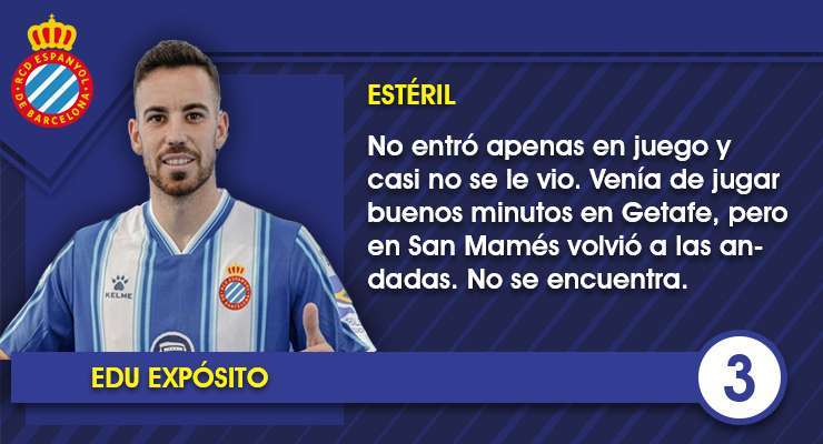 Estas son las notas uno por uno de los jugadores del Espanyol tras la disputa de los octavos de final de la Copa del Rey 2022-23 en San Mamés ante el Athletic Club. Un gol de De Marcos fue suficiente para que los rojiblancos dejaran en la cuenta a los blanquiazules, que dieron un paso al frente tras el paso por vestuarios, pero fue insuficiente.