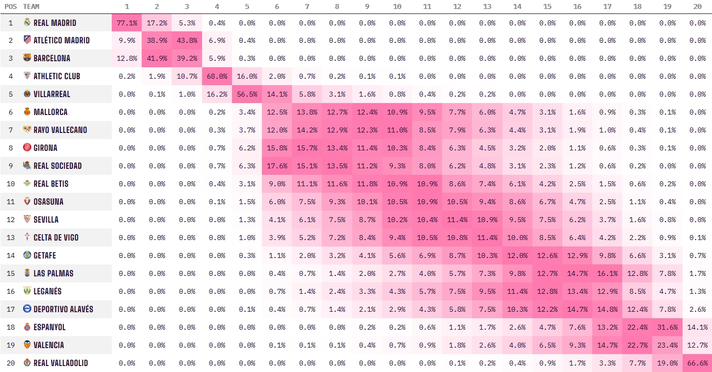 El modelo de predicción de liga desarrollado por Opta es una herramienta avanzada que utiliza estadísticas, clasificaciones y probabilidades para estimar el rendimiento de los equipos a lo largo de una competición. El modelo calcula las probabilidades de victoria, empate o derrota para cada encuentro utilizando cuotas del mercado de apuestas -que reflejan las expectativas del público-, y el Power Ranking de Opta, una clasificación basada en el rendimiento histórico y reciente de los equipos. Se tiene en cuenta la calidad y rendimiento de los rivales, ajustando las probabilidades en función de su posición y desempeño. El modelo ejecuta millas de simulaciones de los partidos restantes de la competición. En cada simulación, los resultados de los encuentros se generan de acuerdo con las probabilidades calculadas. Al finalizar todas las simulaciones, se analiza la frecuencia con la que los equipos terminan en cada posición de la tabla. Esto permite construir predicciones finales detalladas para toda la competición.