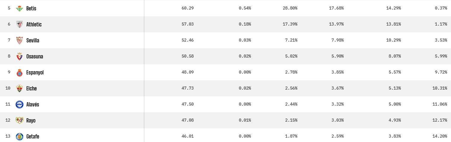 Hace una semana las cifras invitaban a soñar con Europa, aunque fuese tímidamente. Ahora, tras el tropiezo ante los de Pellegrini, las opciones se reducen: sólo un 2,78% de posibilidades de Champions, un 3,85% de Europa League y un 5,57% de Conference. Europa aún está en la foto, pero ciertamente bastante más difuminada.