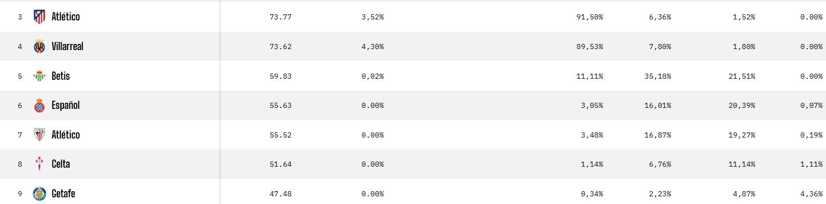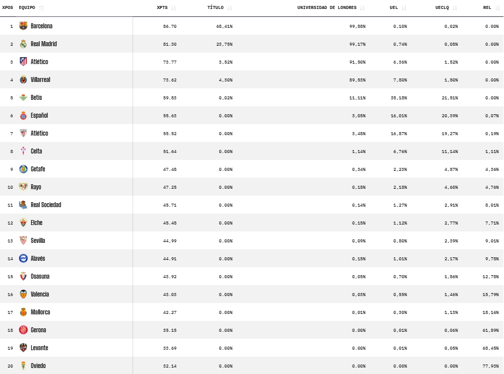 Mientras otros equipos ya empiezan a mirar de reojo la parte baja, los pericos pueden dormir tranquilos. Según el modelo, el Espanyol solo tiene un 0,07 % de riesgo de descenso, lo que lo convierte en el segundo equipo más seguro de toda la liga, solo por detrás del Barça (0,06 %). Nada mal para un equipo que hace unos meses venía de Segunda y que ahora está peleando con los grandes.