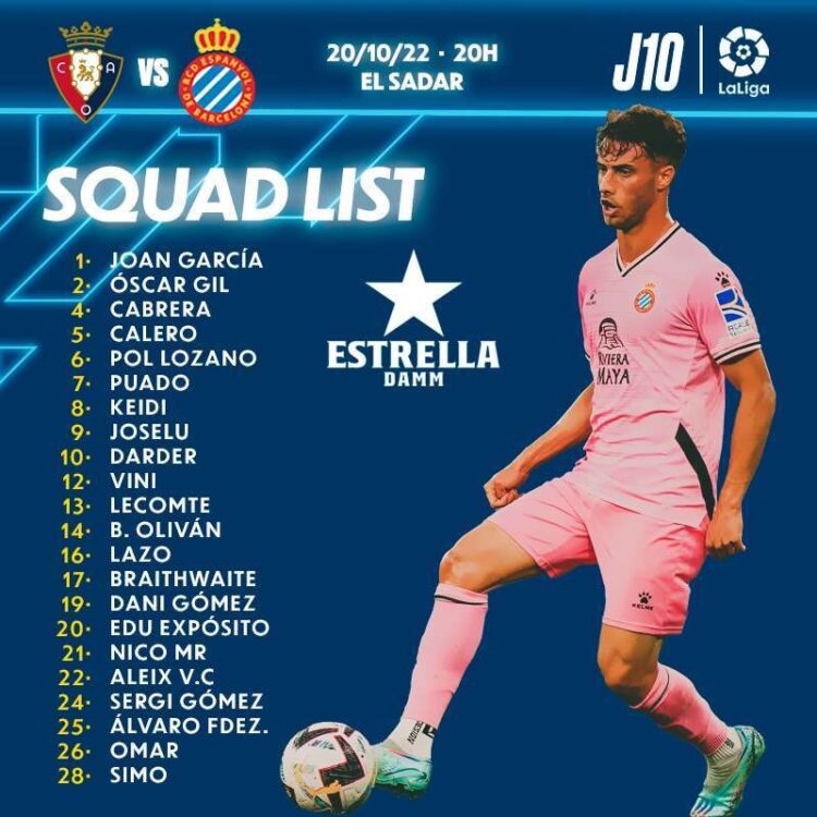 La lista completa de convocados del Espanyol para el duelo ante CA Osasuna es la siguiente: Joan García, Óscar Gil, Cabrera, Calero, Pol Lozano, Puado, Keidi Bare, Joselu, S. Darder, Vini Souza, Lecomte, Brian Oliván, Lazo, Dani Gómez, Edu Expósito, Nico MR, Aleix Vidal, Sergi Gómez, Álvaro Fernández, Omar y Simo.